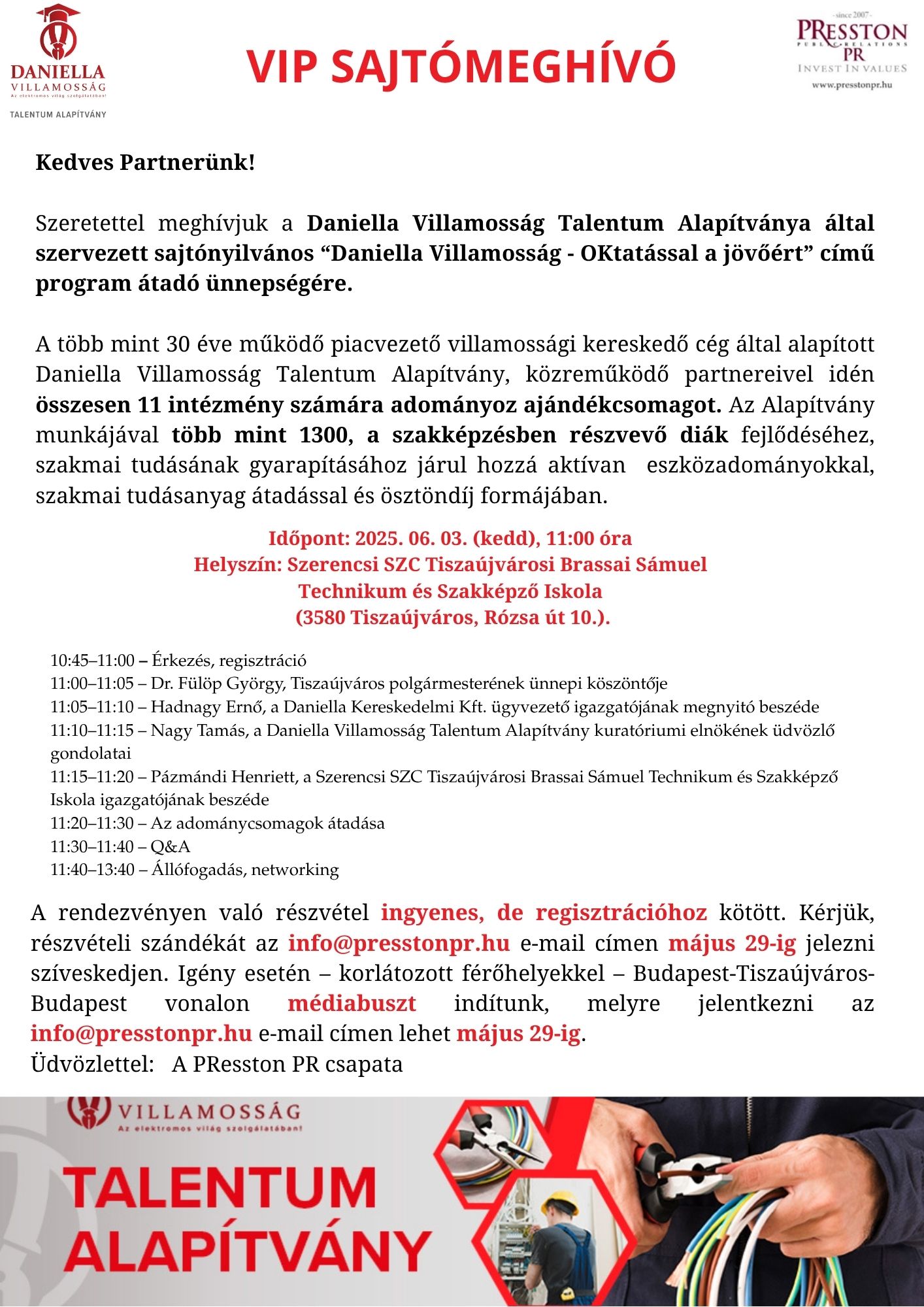 - VIP Sajtómeghívó - Daniella Villamosság Talentum Alapítvány 2024.06.12.
