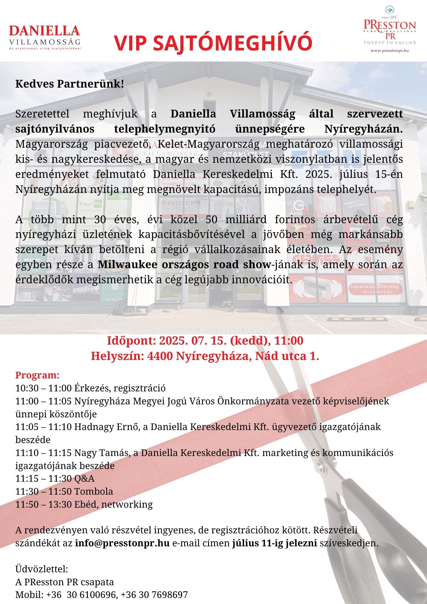 - Daniella Villamosság nyíregyházi telephelymegnyitó ünnepség - VIP sajtómeghívó 2025.07.15.
