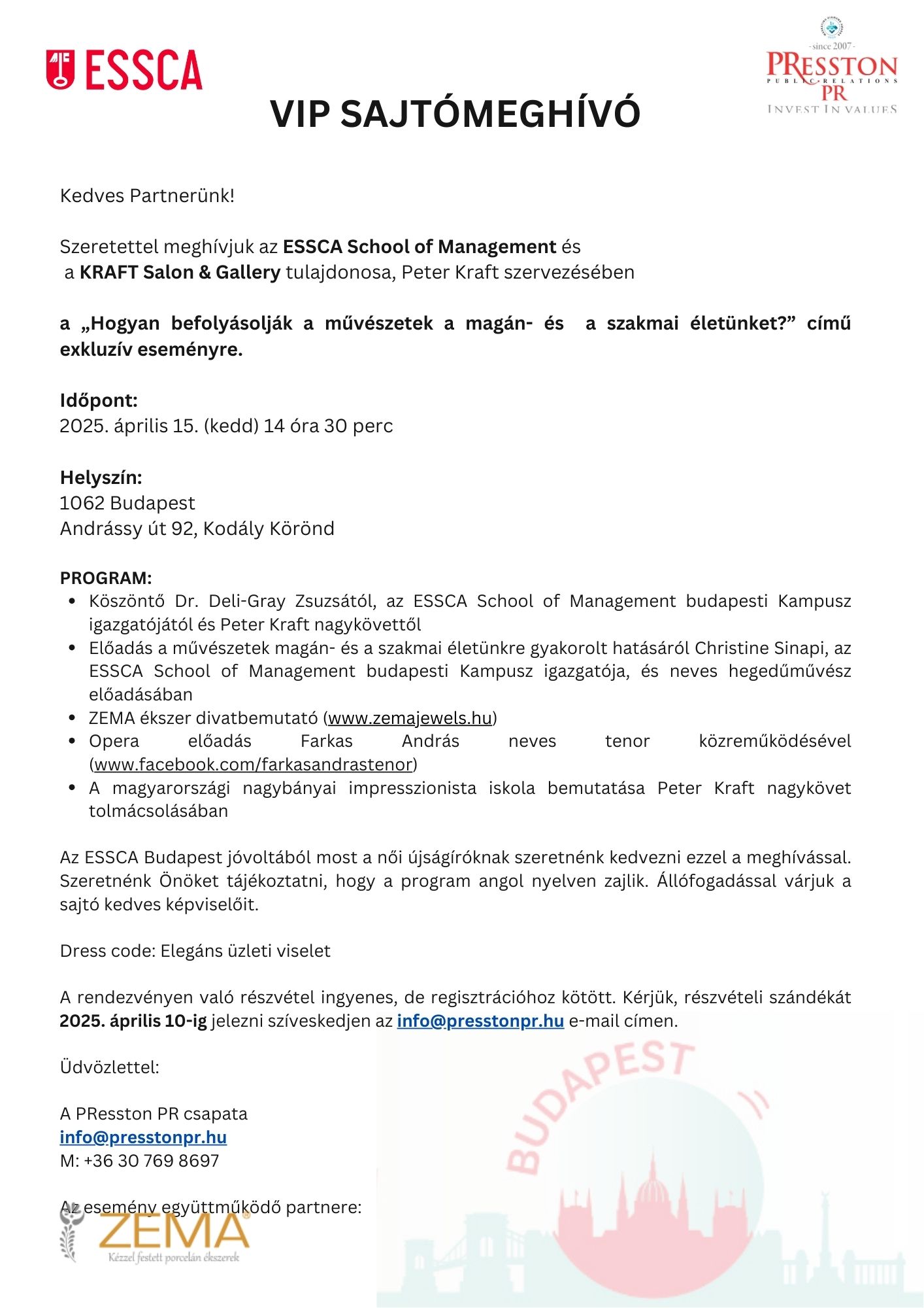 - ESSCA - Hogyan befolyásolják a művészetek a magánéletünket és a szakmai életünket VIP sajtómeghívó 2025.04.15.