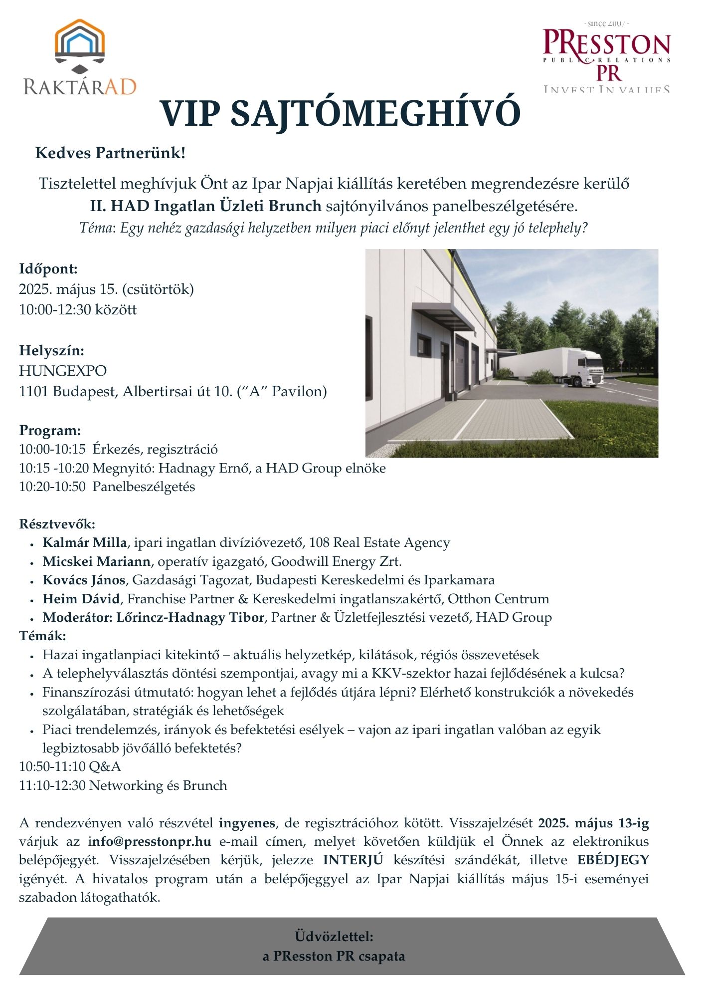 - RaktárAD II. HAD Ingatlan Üzleti Brunch - VIP sajtómeghívó 2025.05.15.