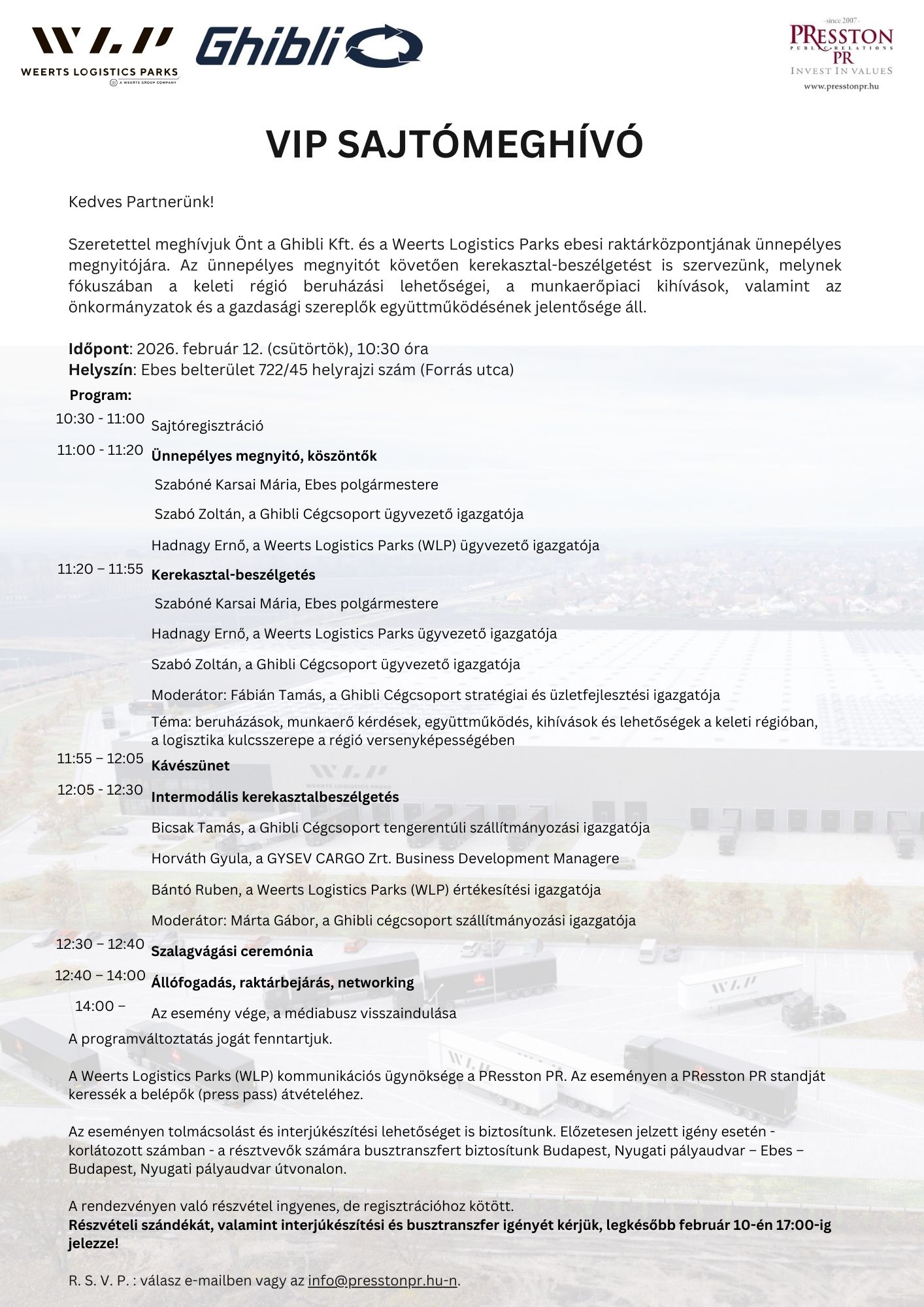 - A Ghibli Kft. és a Weerts Logistics Parks ebesi raktárközpontjának ünnepélyes megnyitója - VIP Sajtómeghívó 2026.02.12.